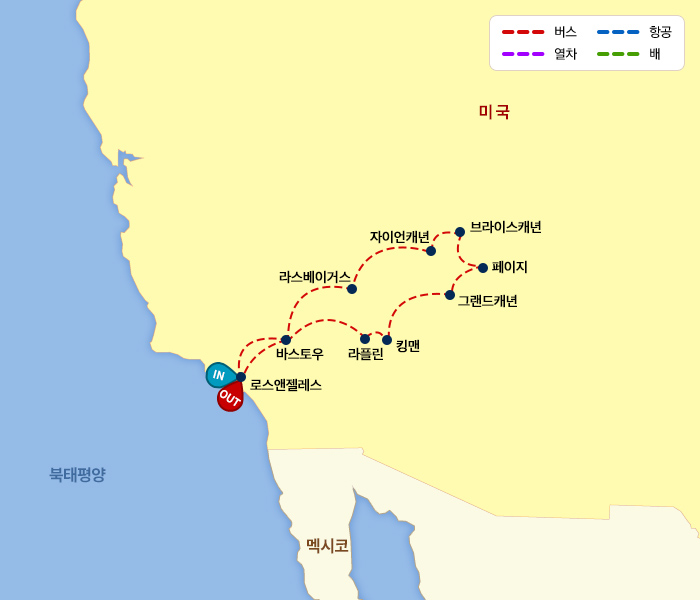 인천-로스앤젤레스(1)-바스토우/라스베이거스(1)-자이언캐년/브라이스캐년/페이지(1)-그랜드캐년/라플린(1)-바스토우/로스앤젤레스(1)-인천