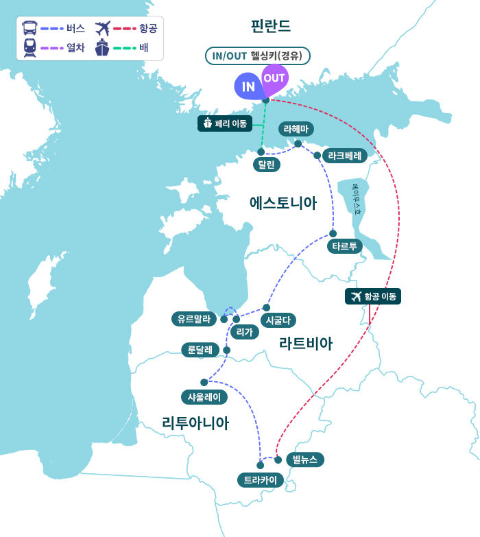 √ 세 나라의 동화같은 구시가지와 다채로운 문화 유적, 자연관광이 포함된 발트 완전 정복 일주 와 헬싱키 관광① 비슷하지만 다른 발트 3국 수도들의 UNSECO 구시가지 - 13세기 종교적인 중세 고딕 양식들로 발트3국 중 가장 동화같다는 평을 듣는 에스토니아 '탈린' UNSECO 구시가지- 아르누보 건축물들과 여러 건축양식이 혼합된 북유럽의 아르누보 수도 라트비아 '리가' UNSECO 구시가지- 웅장한 바로크 양식의 교회와 붉은 벽돌 건물들이 인상적인 리투아니아 '빌뉴스' UNSECO 구시가지② 에스토니아 주요 일정 - 탈린 구시가지의 여러 문화유산 알렉산더 넵스키 성당 / 키에크 인 더 코크 박물관(내부) / 성 올라프 교회- 에스토니아 북쪽 해안의 자연경관과 문화경관을 둘러 볼 수 있는 라헤마 국립공원 / 비루습지 하이킹- 중세 시대 건축물과 생활상을 체험할 수 있는 라크베레성- 2024년 유럽 문화수도로 지정된 문화와 교육의 도시 타르투